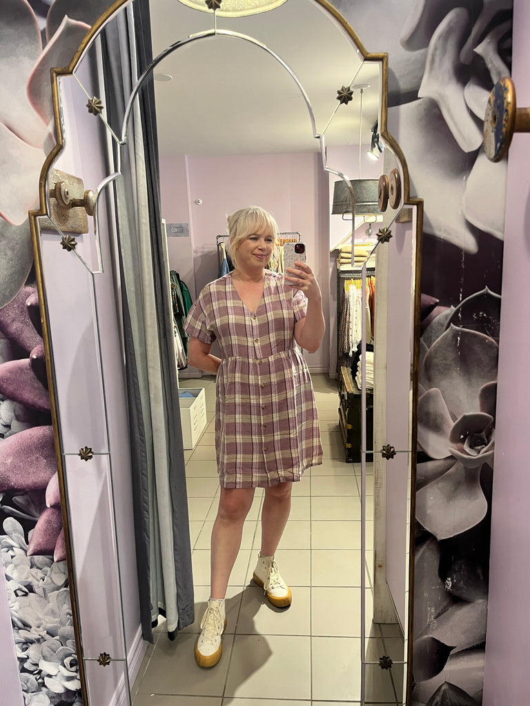 • Josiane, co-proprio du Jupon Pressé, mesure 1m69 et porte habituellement la taille L. Pour la robe Ylona, c'est la grandeur XL qui convient pour éviter que ça ne tire à la poitrine. / Mensurations : Poitrine : 107 cm, Taille : 94 cm, Hanches : 107 cm / Photo 4