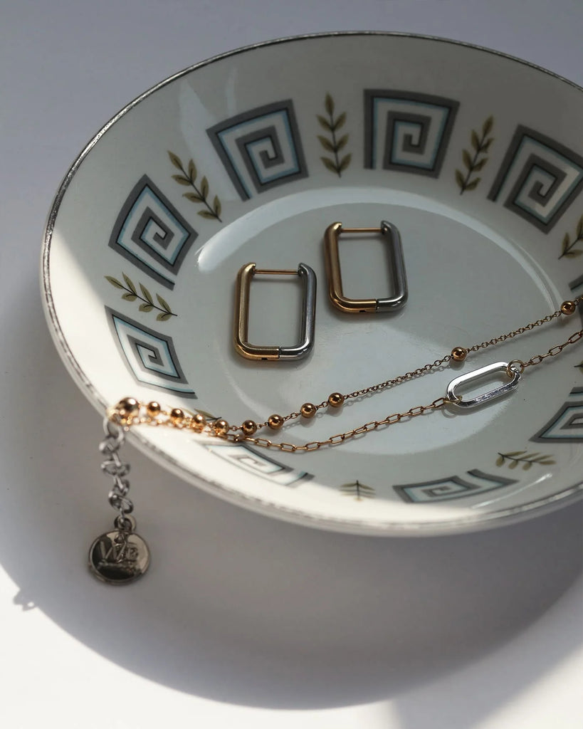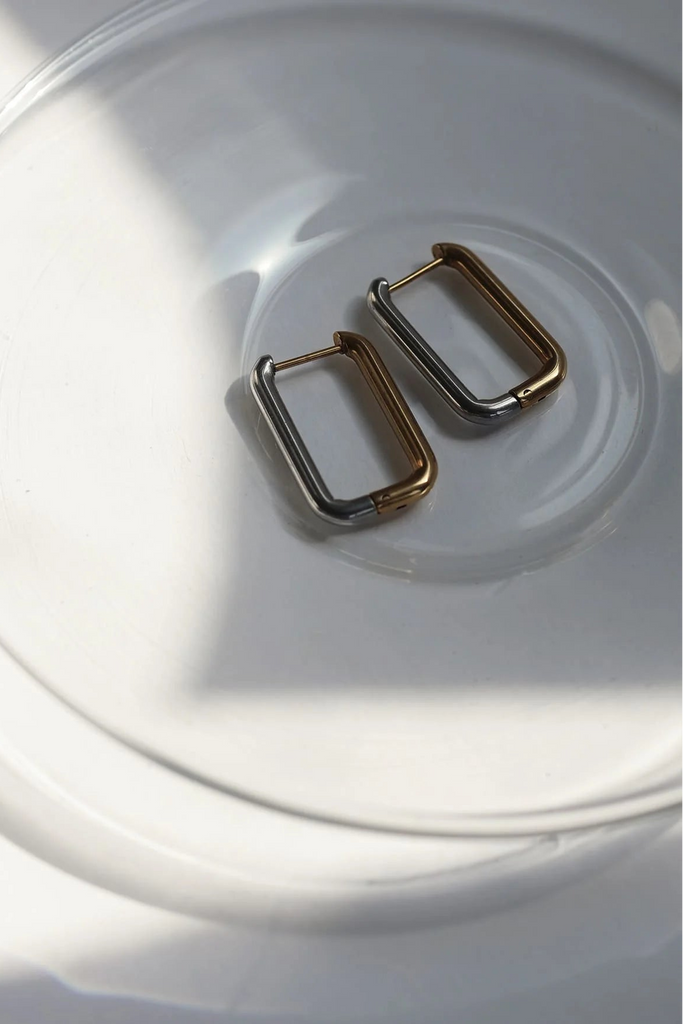 Deux tons, une seule évidence. Les créoles bicolores Duet marient or et argent dans une parfaite symétrie, pour que tu n’aies jamais à choisir. Porte ces anneaux rectangulaires en acier inoxydable et laisse tes oreilles parler pour toi. Une pièce moderne et versatile, idéale pour celles qui aiment les détails affirmés et le raffinement discret.