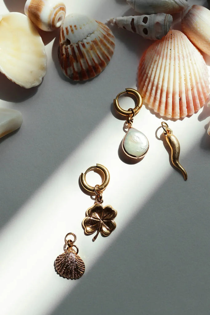 Comme leur nom le suggère, les boucles d’oreilles Chance sont pensées pour t’accompagner avec une touche de magie au quotidien. Ces petites créoles en acier inoxydable doré célèbrent la liberté d’expression grâce à leurs pendentifs interchangeables. Quatre symboles à mélanger selon ton humeur : un coquillage plaqué or, un pendentif en nacre blanche, un trèfle à quatre feuilles et un cornicello porte-bonheur. Porte-les à ta façon — un, deux, trois ou les quatre. Tout est possible. Un bijou modulable, joyeux et rempli de sens. Comme toi.