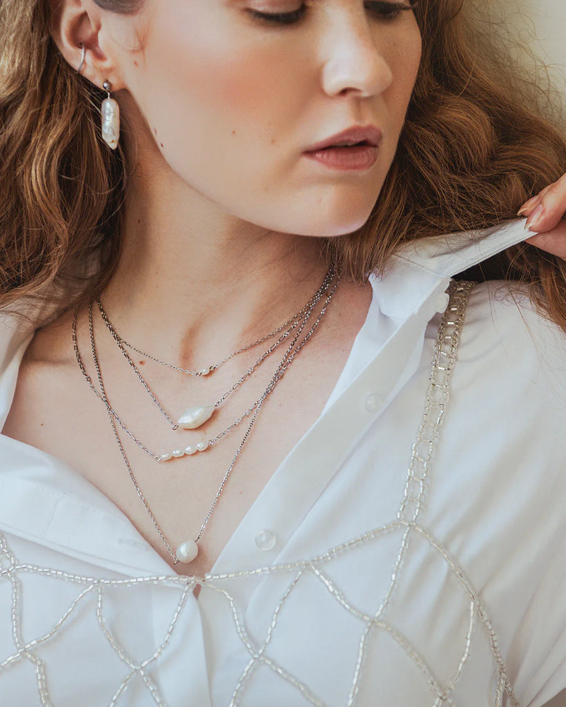 Plonge au cœur de l’immensité avec Oceane, où la beauté brute se révèle à travers ces boucles d’oreilles argent. Une perle baroque unique, à la forme irrégulière et majestueuse, y est suspendue avec élégance, accrochée à un clou d'oreille en forme de petite boule. L'imprévisibilité devient art.