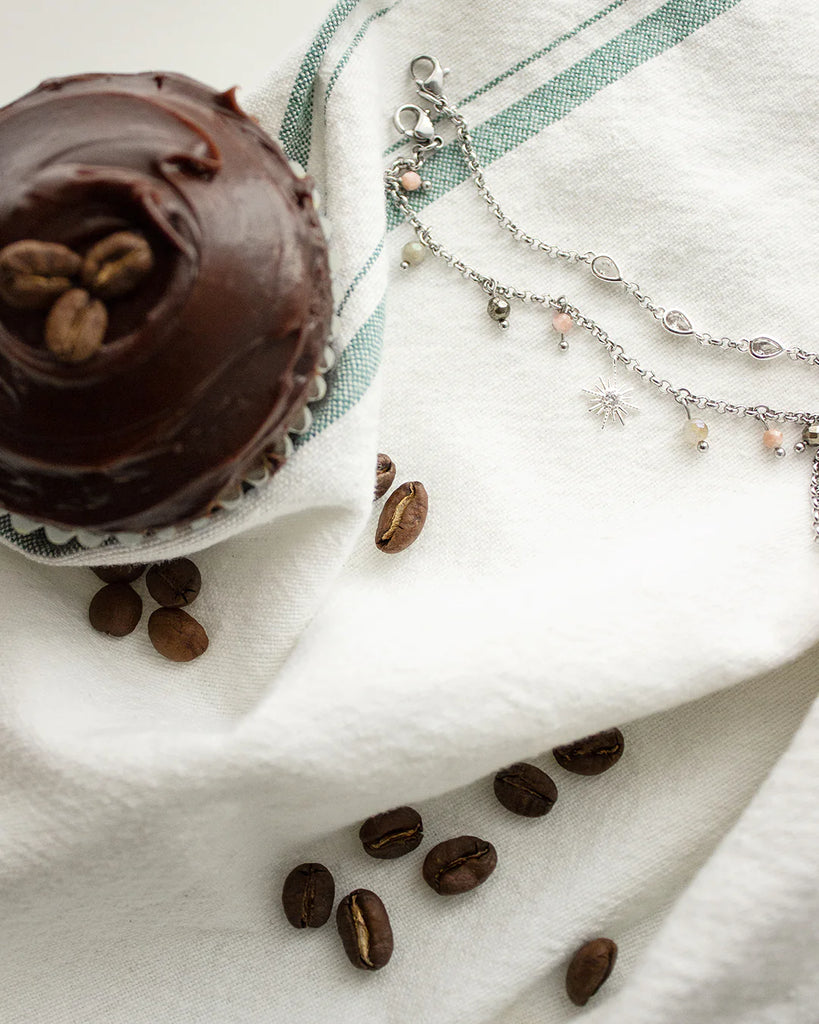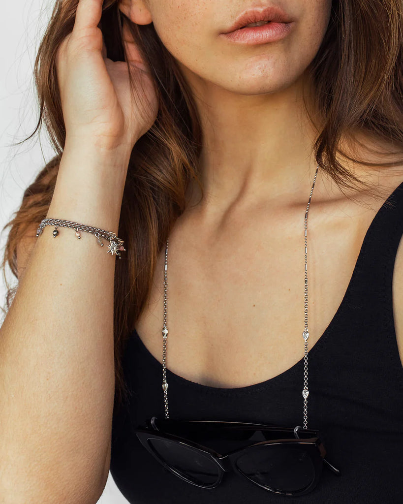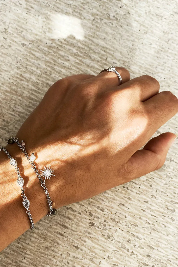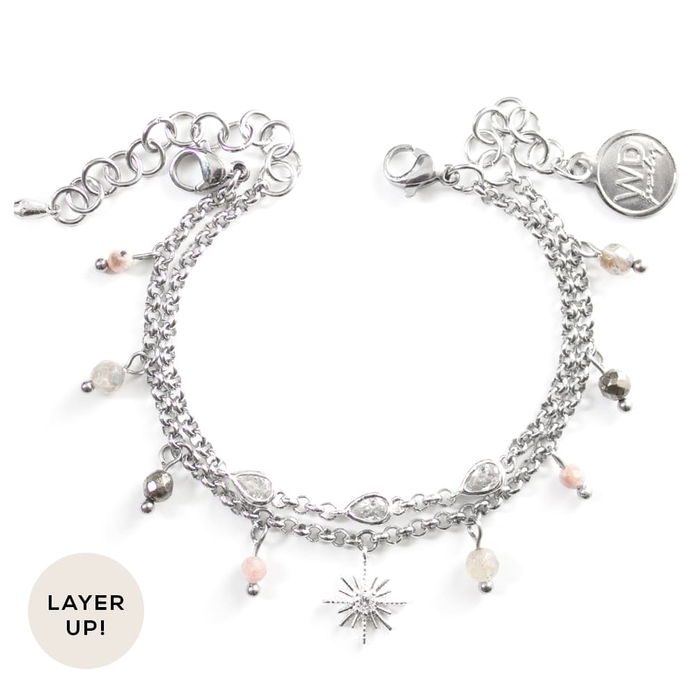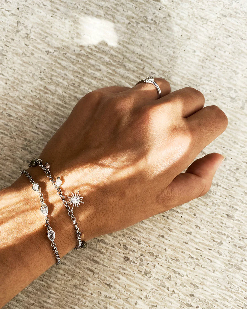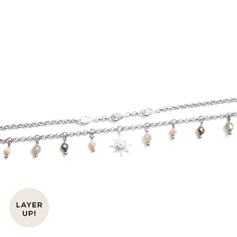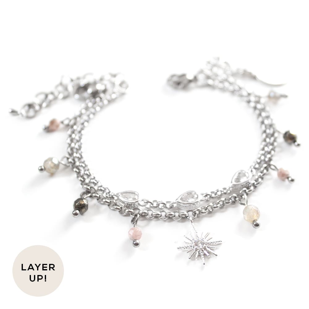 Il t'enveloppera tel un nuage de poussière d'étoile. Laisse le bracelet Stardust te révéler l'infini qui t'entoure. Stardust est un ensemble de deux bracelets aux breloques plaquées en argent sterling. La première chaîne est enjolivée de petits cristaux en forme de goutte d’eau. La deuxième chaîne est accentuée de pierres de pyrite, de rhodonite et de labradorite. Au centre, une breloque en forme d’étoile scintillante dévoile son coeur en cristal de zircon. Personne ne peut lui résister!