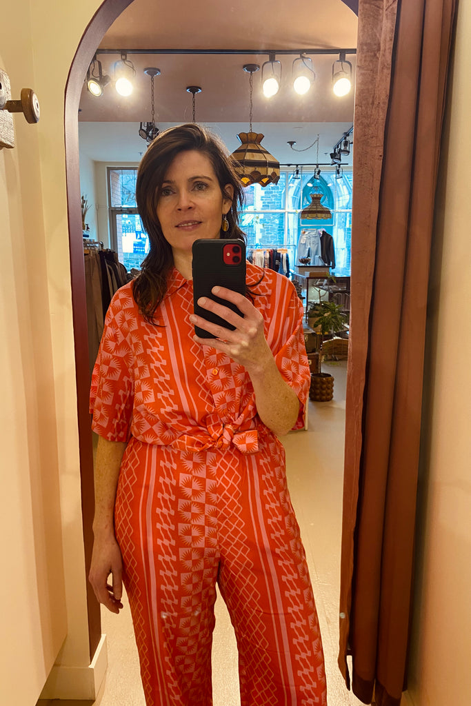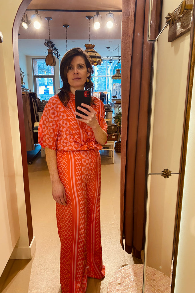 • Blouse avec imprimé mélangeant soleil, géométrie et rayures