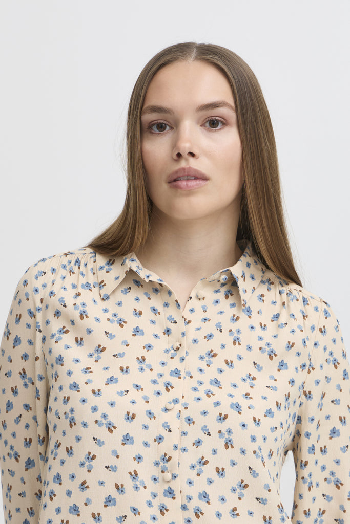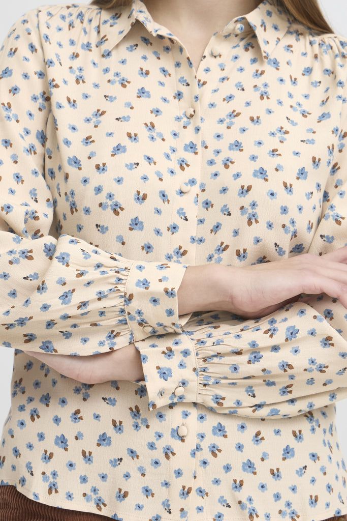 Son imprimé fleuri aux petites touches de bleu tendre et de brun caramel réchauffe le cœur, et ses fronces délicates aux épaules… oh là là, c’est la petite touche romantique qui change tout ! Tu peux la porter seule pour un look léger ou la glisser sous le pull Irmella pour un effet encore plus douillet. Bref, elle est prête à t’accompagner partout, du bureau aux brunchs du dimanche.