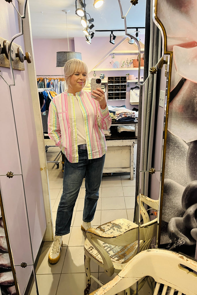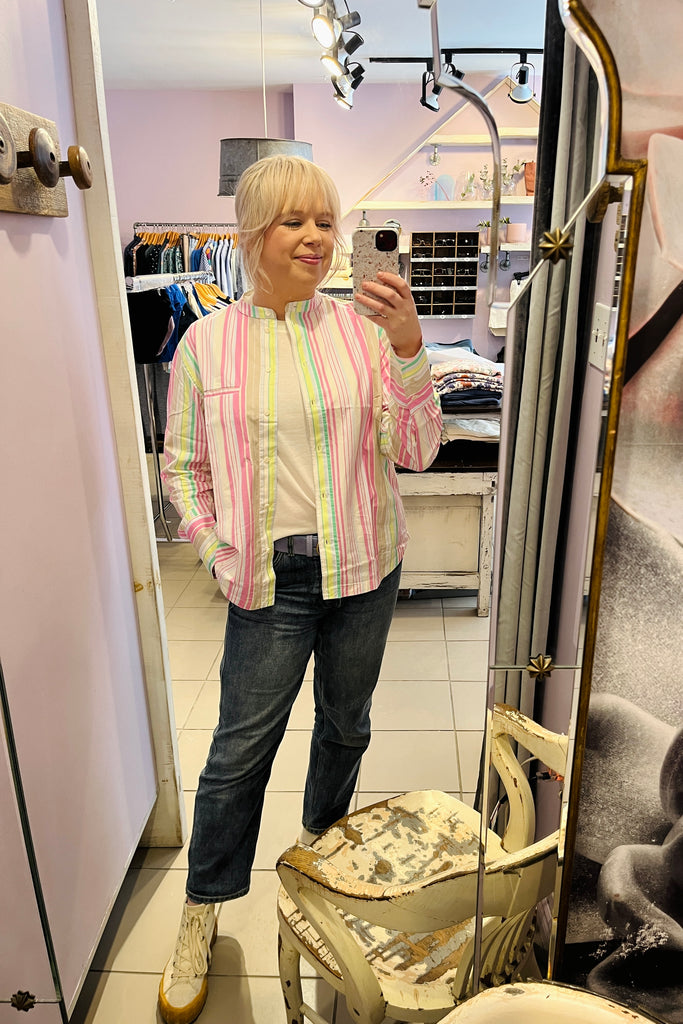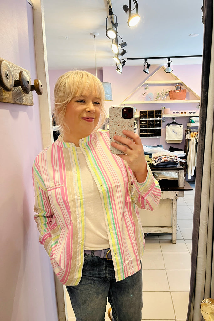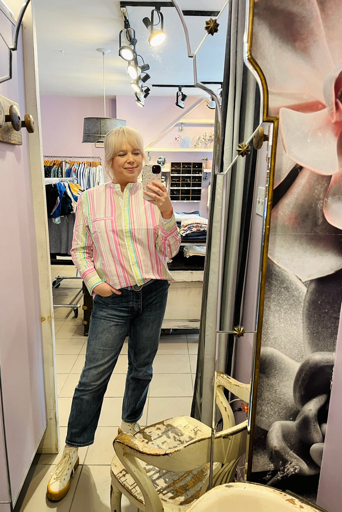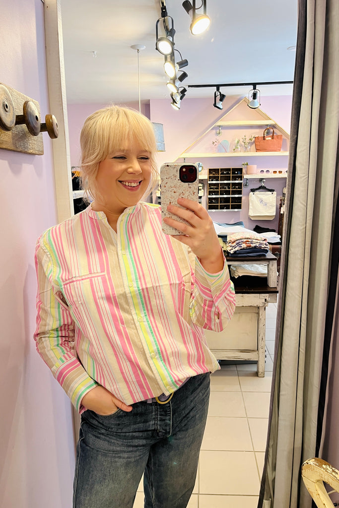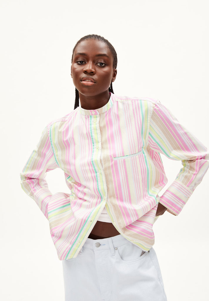 Tu cherches à mettre du punch dans ta garde-robe? Voici Sennaama de la marque Armedangels; une blouse aux rayures colorées que tu prendras plaisir à agencer!