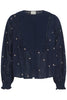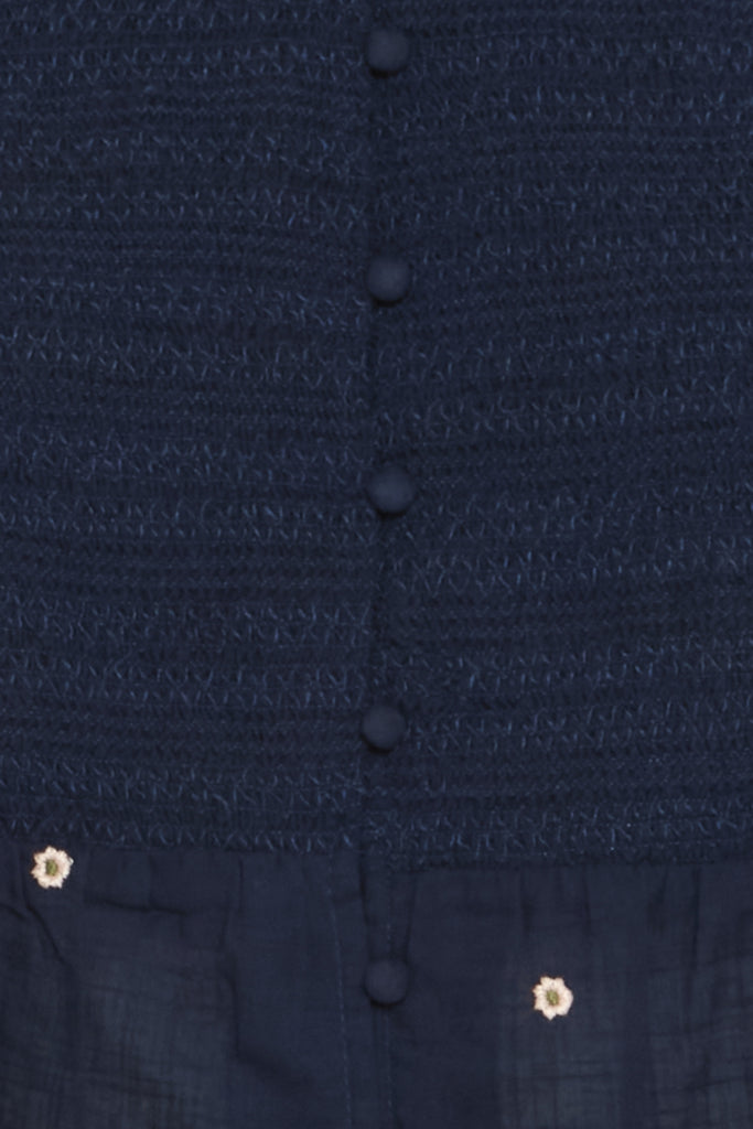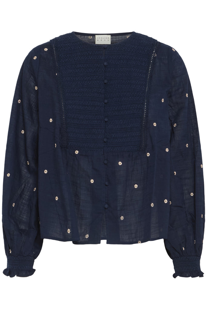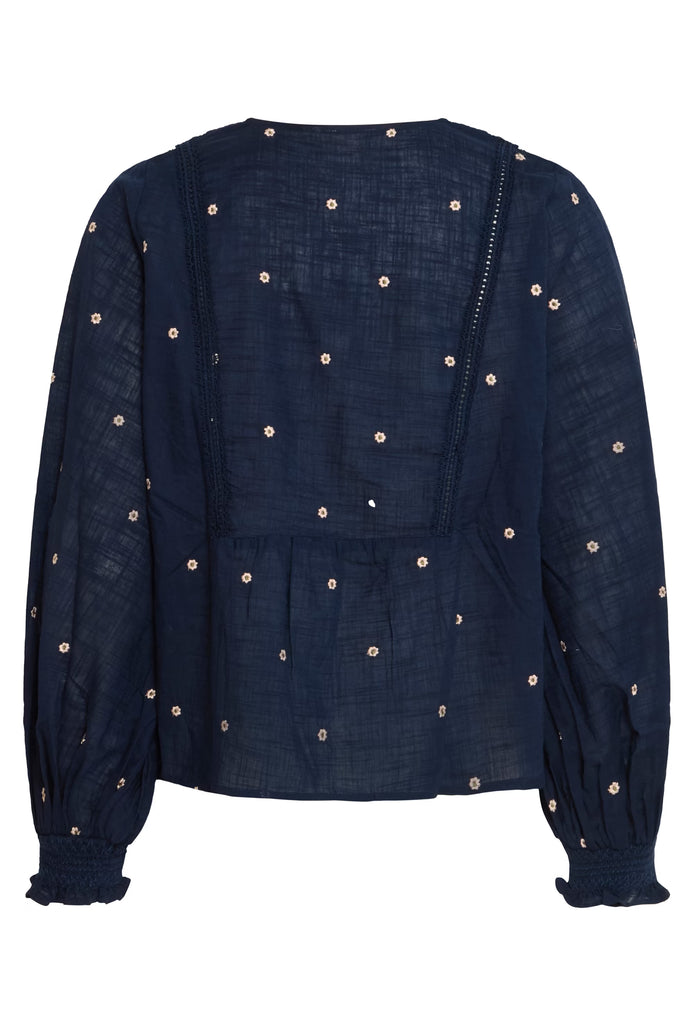 Tu sais, cette blouse qu’on enfile et qui rend instantanément une tenue spéciale, même avec un simple jean ? C’est exactement l’effet de la Chemise Irgalina d’Atelier Rêve. Avec sa teinte marine profonde et ses fines broderies florales rose pâle, elle joue la carte de la féminité. Le détail du plastron texturé façon nid d’abeilles et les manches légèrement ballons apportent ce petit twist romantique qu’on aime tant.