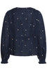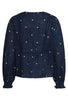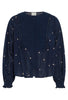 - Pour ses broderies délicates, dessinant de fines fleurs rose poudré sur un fond bleu profond.