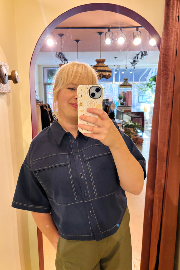 Tu cherches la chemise parfaite pour un look structuré, mais sans compromis sur le confort? La chemise Iris est là pour ça. Avec sa coupe boxy qui tombe parfaitement, ses coutures contrastées et ses détails de découpes, elle joue habilement entre modernité et simplicité.