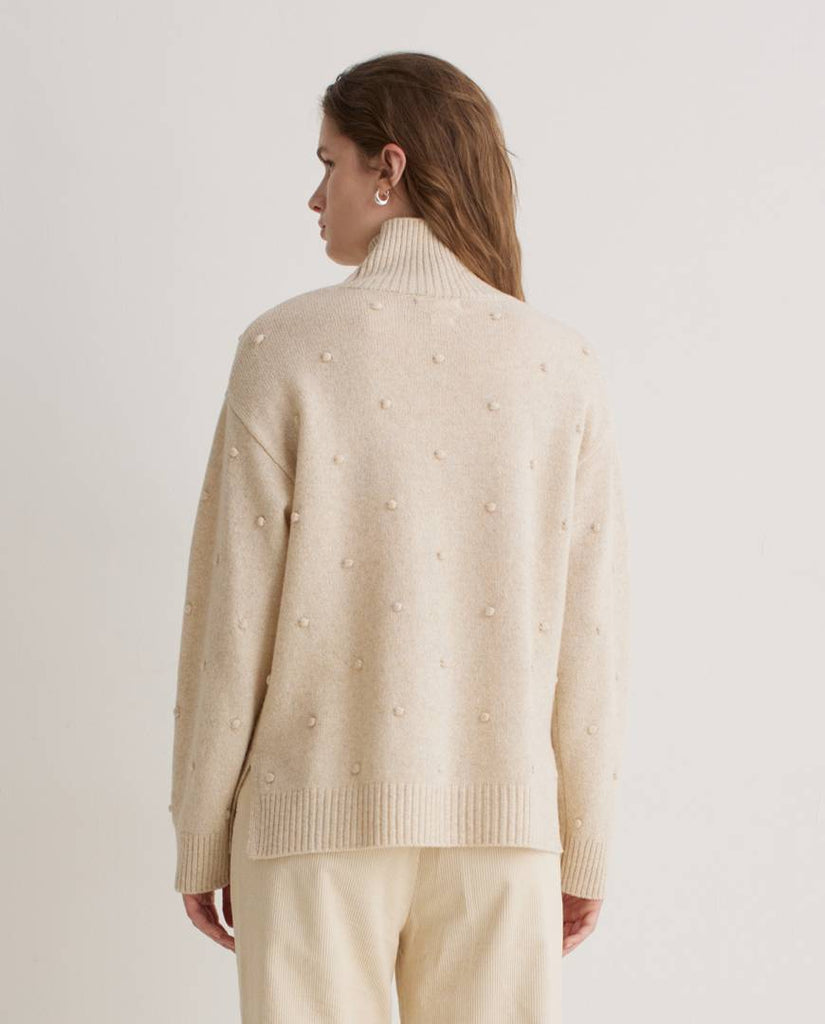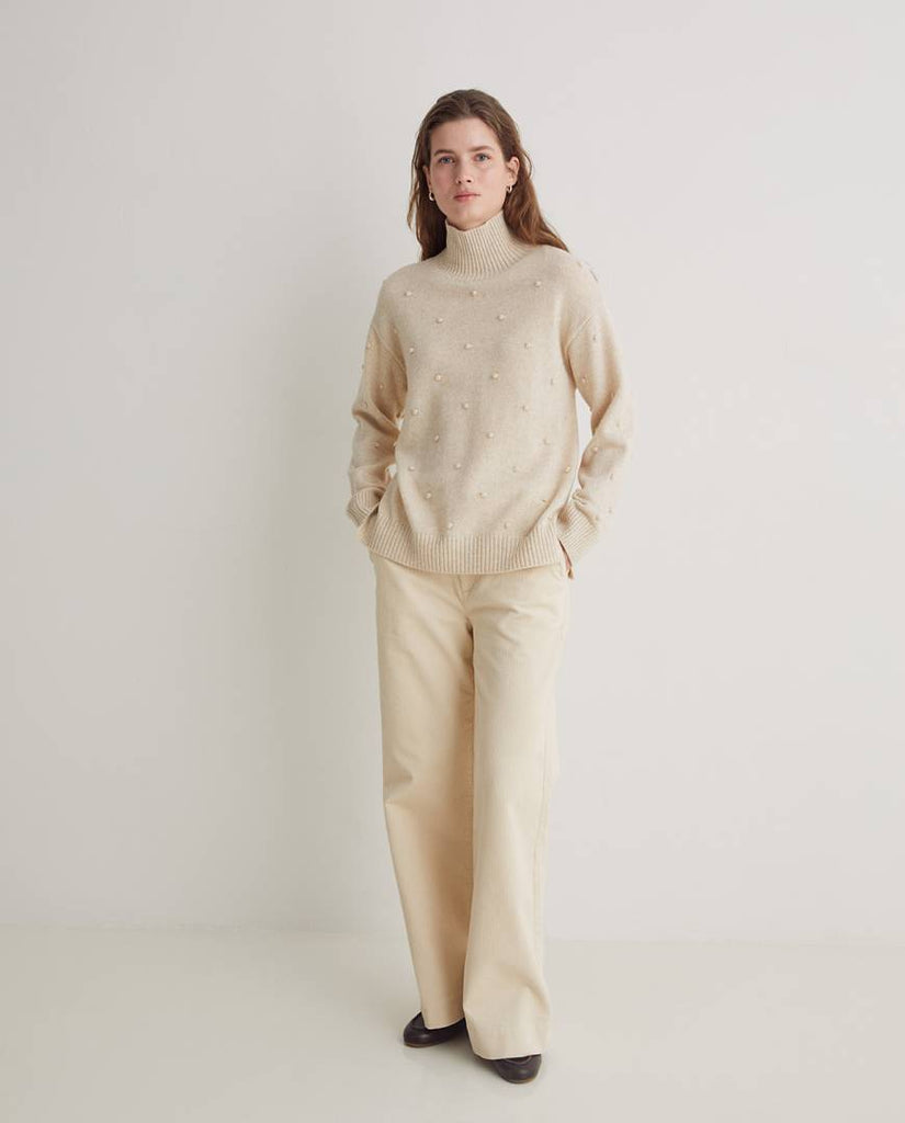 Coup de cœur instantané 💛 Ce nouveau pull signé Yerse a tout pour plaire : une texture toute douce et ces petits pompons ton sur ton qui lui donnent une touche ludique. Léger, mais bien chaud grâce à sa laine naturelle, il t’accompagne aussi bien au bureau qu’en weekend cocooning.