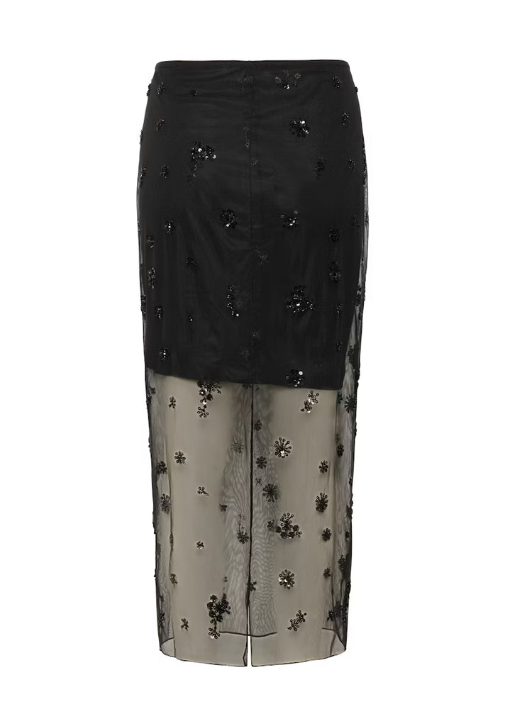 • Jupe longue transparent en mesh décorée de broderies florales de perles et de paillettes