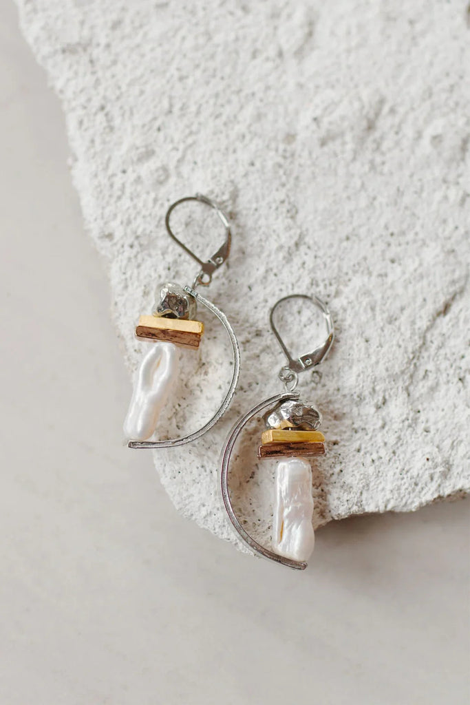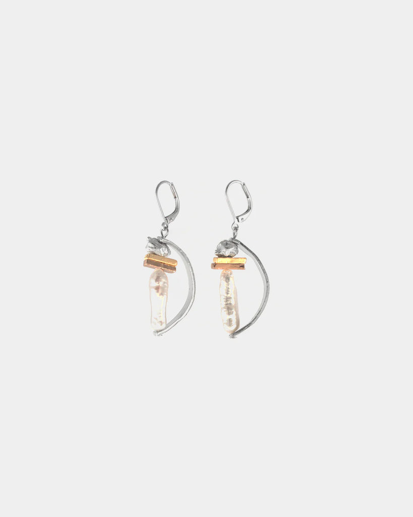 - Boucles d'oreilles élégantes deux tons ornées d'une structure de pièces d'étain et d'une perle d'eau douce