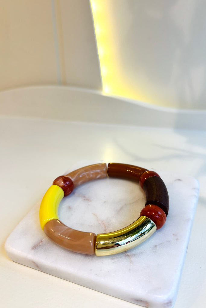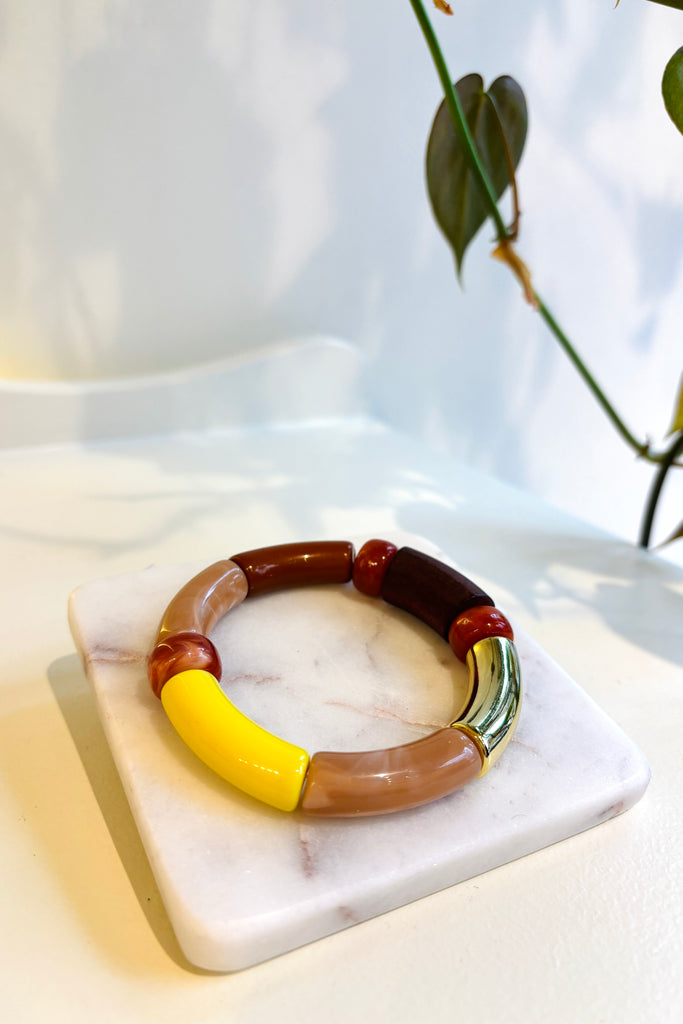 Couleurs: jaune, brun, terracotta, or, beige-rosé