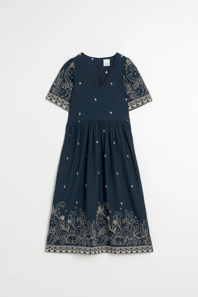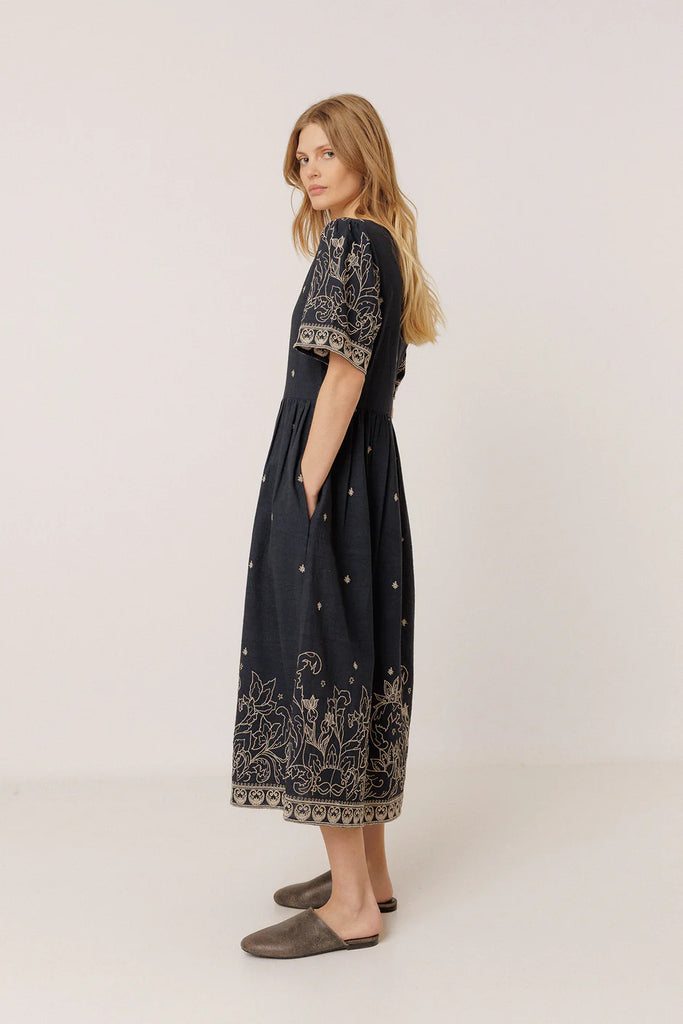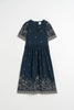 - Robe longue avec jolies broderies; de petites florales sur l'ensemble et de plus denses à motif botanique aux manches et au bas de la jupe