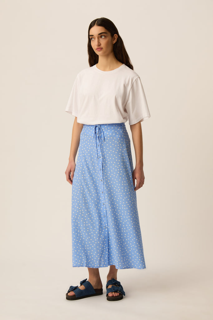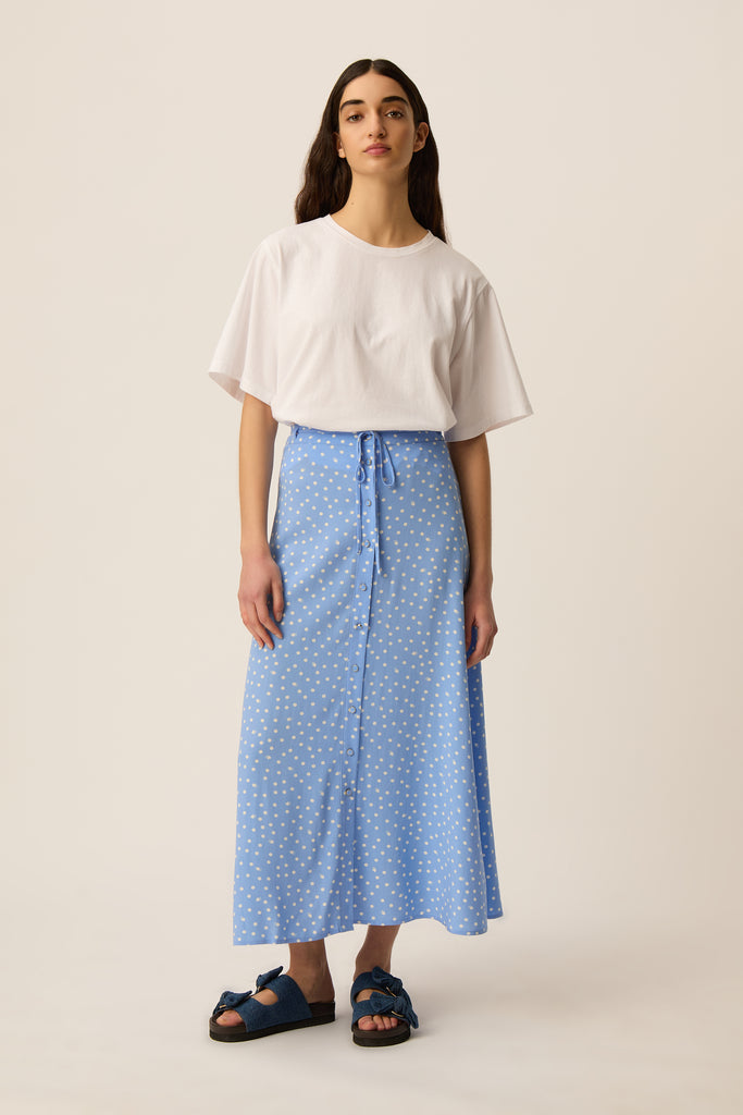 • Jupe longue avec imprimé exclusif Des Petits Hauts "Dots Ciel" qui revisite le classique pois avec subtilité et modernité : chaque point respire sur un fond bleu ciel, offrant un motif iconique et reconnaissable, empreint de légèreté et d’élégance.