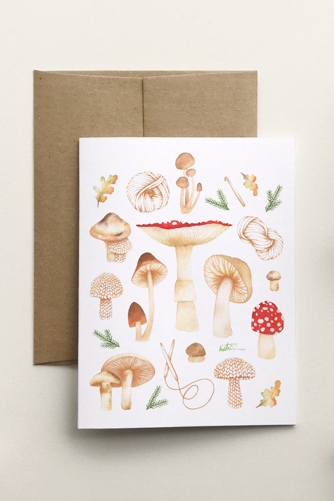 Charmante carte de souhaits avec douce illustration de champignons sauvages.