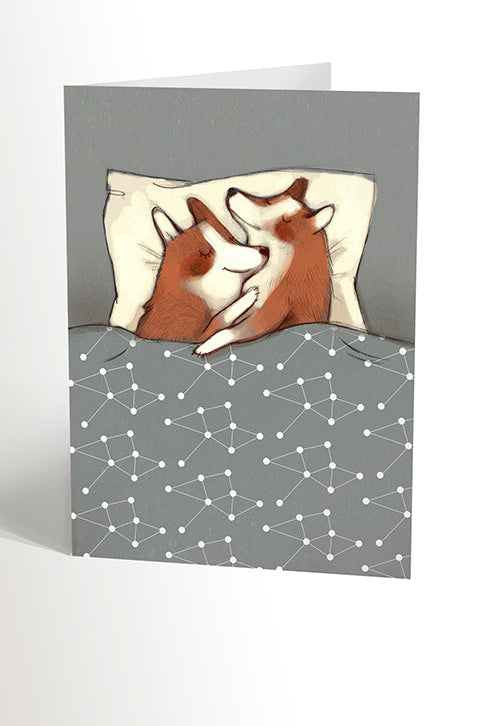 Charmante carte de souhaits avec une illustration de deux corgis couchés dans un lit.