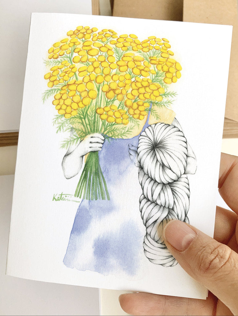 Charmante carte de souhaits avec douce illustration une femme au bouquet de fleurs de tanaisie et son écheveau de laine.