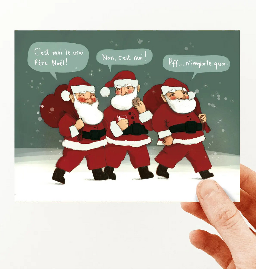 Charmante carte de souhaits avec une illustration de trois Pères Noël en style bande dessinée humoristique, qui se dispute le titre du vrai Père Noël.