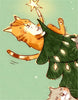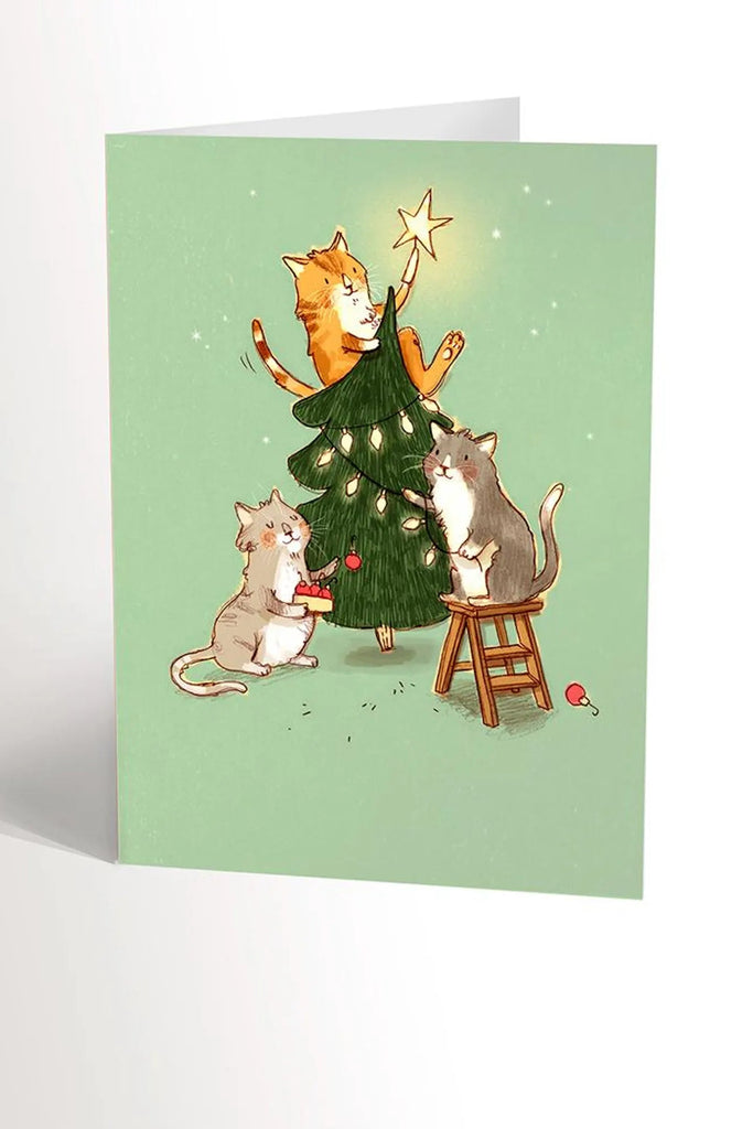 Charmante carte de souhaits avec une illustration de chats décorant un sapin de Noël. Idéale pour les amoureux des chats.