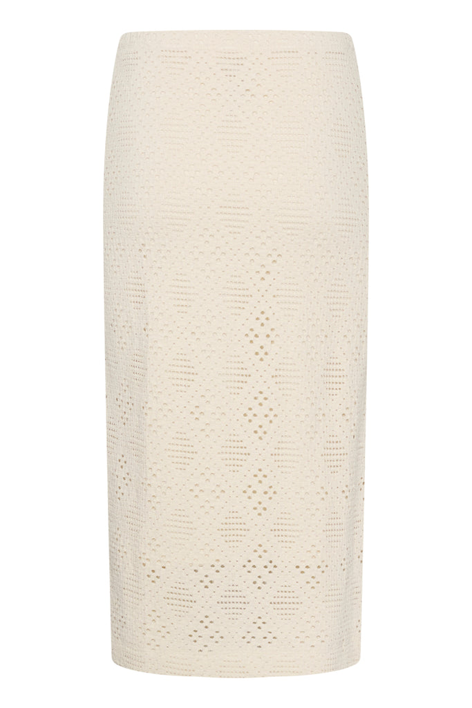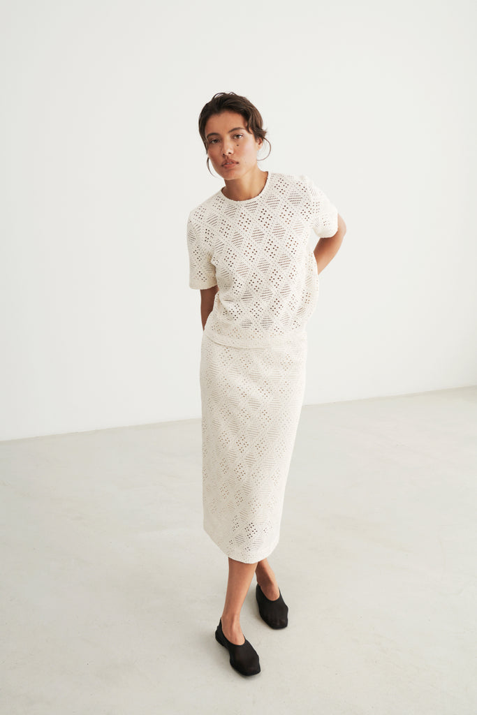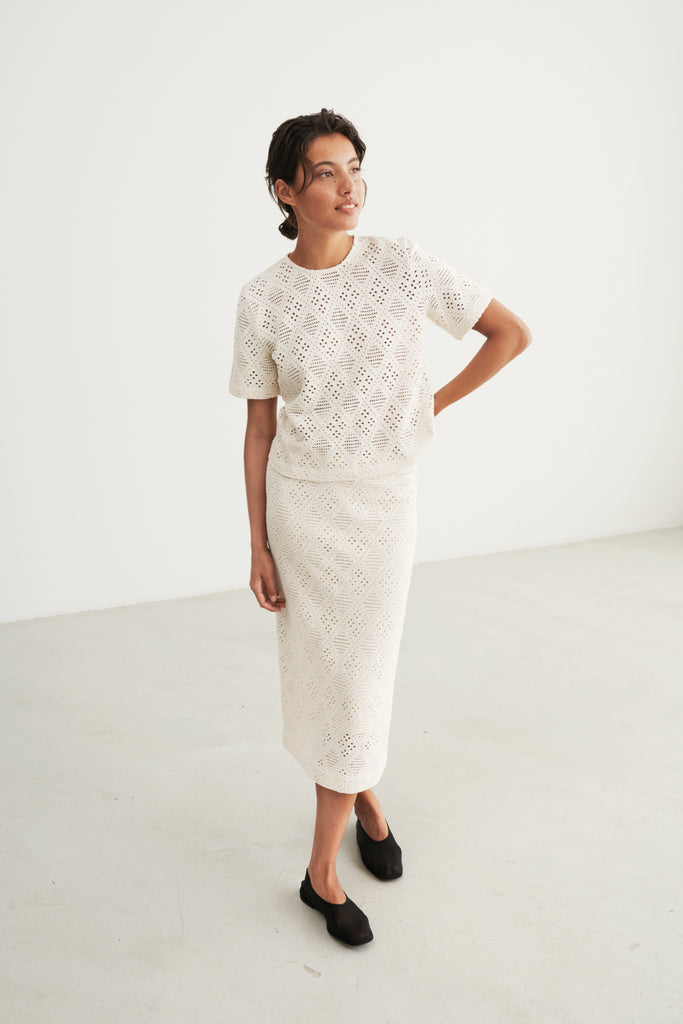 • Jupe longue dans une maille pointelle / La particularité de la pointelle est d'avoir dans le tricot des mailles ajourées formant un motif répétitif; comme pour le haut Tala, des diamants