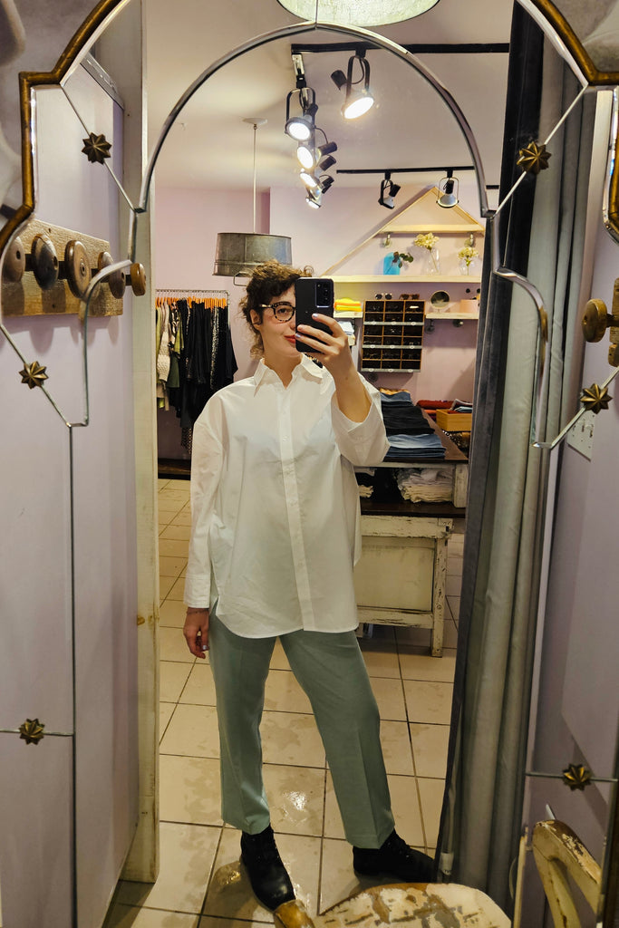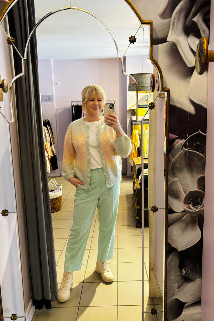 • Josiane, co-proprio du Jupon Pressé, mesure 1m69 et porte habituellement du L. Pour le pantalon Naxa, c'est le L qui lui convient. / Mensurations: Poitrine: 107 cm, Taille: 94 cm, Hanches: 107 cm / Photos 4-7