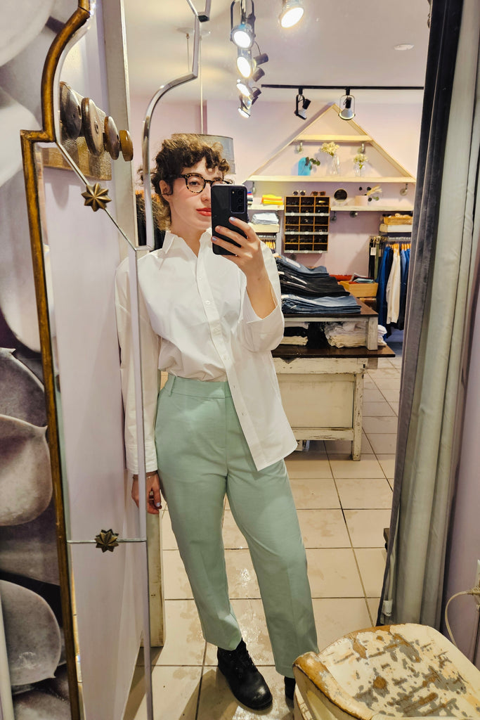 * Tu es en amour avec ce style? Bonne nouvelle: le Naxa est disponible en boutique et en ligne avec un revers au bas dans la couleur bleu pâle.