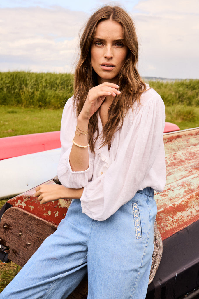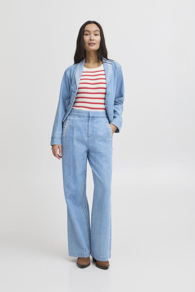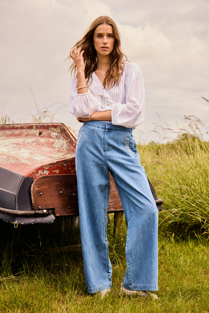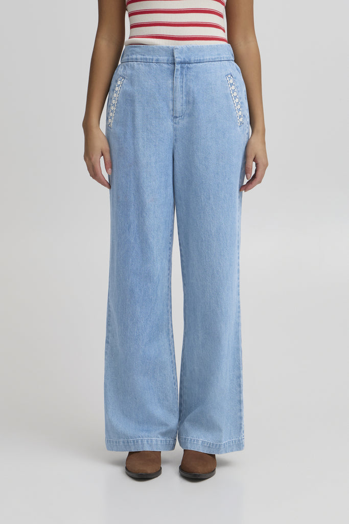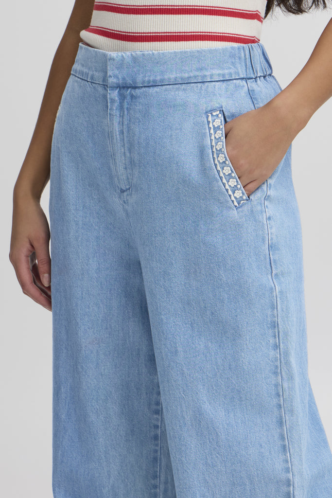 • Pantalon en denim décoré de petites broderies florales aux poches