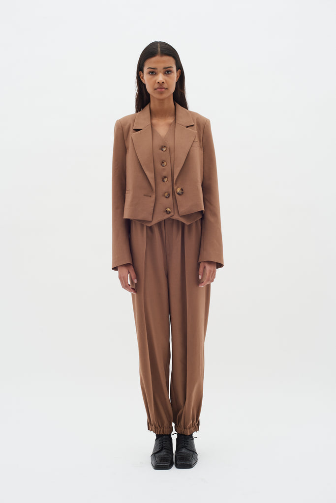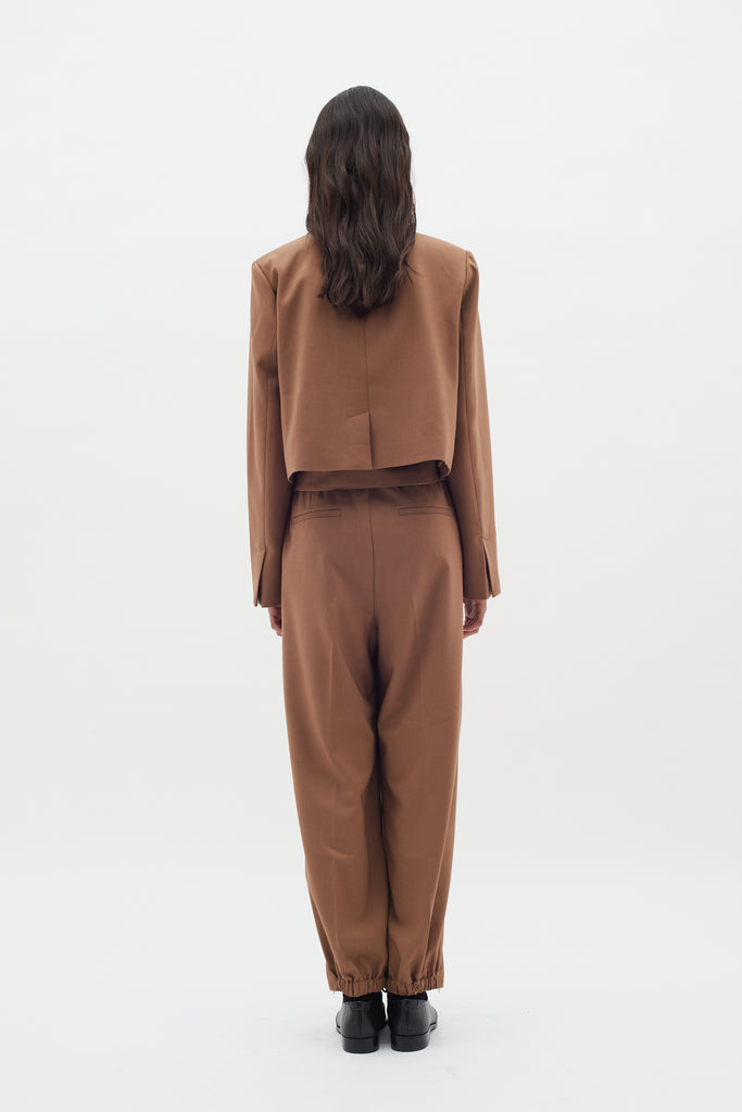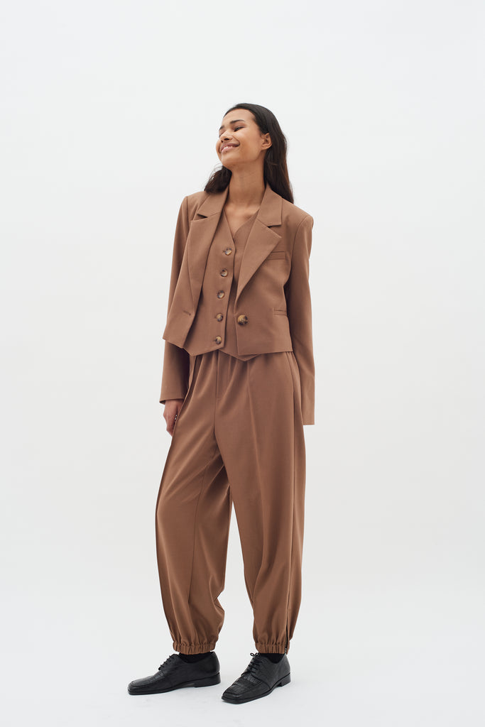 • Jambes larges se resserrant au bas par un élastique recouvert et zips invisibles sur les côtés