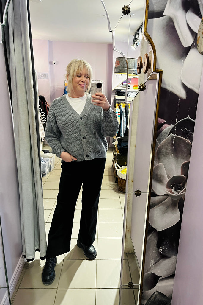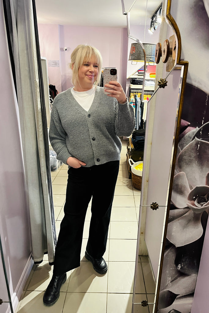 • Sylvie, co-proprio du Jupon Pressé, mesure 5'6" et porte habituellement la taille L ou du 29-30 pour un jean structuré. Pour ce style, c'est le 30 qui lui convient. / Mensurations: Poitrine: 92 cm, Taille: 77,5 cm, Hanches: 108 cm / Photo non-dispo