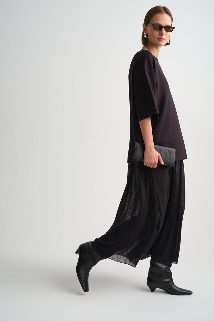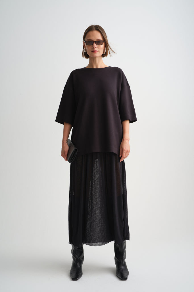 Une pièce pleine de caractère qui réunit deux textures complémentaires : le haut façon robe tee-shirt en modal ultra doux, et le bas en voile fluide légèrement transparent qui bouge avec légèreté à chaque pas. Résultat? Une robe longue moderne, minimaliste et incroyablement confortable, qui dégage une allure chic sans effort.
